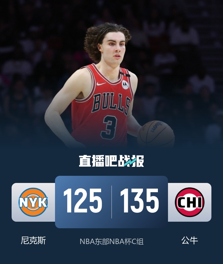 比赛开场,尼克斯率先发力,建立优势,此后公牛通过进攻端提速逐渐缩小差距,追平比分,随后双方陷入拉锯战,节末轮换阵容登场后公牛打出一波9-2取得领先。次节公牛延续攻势,扩大分差,吉迪单节外线四投全中,带领球队半场砍下72分,领先19分进入下半场。易边再战,公牛手感有所冷却,唐斯连续杀伤内线,单节砍下15分,尼克斯抓住机会将分差缩小到个位数,此后一直维持在十分上下波动。末节尼克斯外线连续命中,一度将分差缩小到2分,但公牛总能作出回应,最后三分钟吉迪和武切维奇连续打成,分差重新回到两位数,比赛失去悬念,最终公牛135-125力克尼克斯,开季取得五连胜。